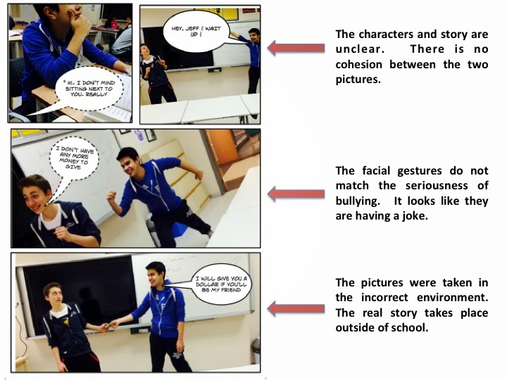 Now, I know they’re are not up there with the quality of Marvel Comics (a previous post about another comic book ELT activity), but at least they tell a message, and it is their own doing.  They got creative, eventually, and that was rewarding for us all.  I think the most important aspect of this activity is the reflective recall of the excerpts of bullying from Bradley in the book.  It gives students a more interesting and productive way for going back to the narrative, rather than simply looking at notes, highlights and annotations.  We hope you can try it out, and let us know…